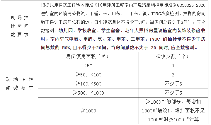 根據(jù)民用建筑工程驗(yàn)收標(biāo)準(zhǔn)《民用建筑工程室內(nèi)環(huán)境污染物控制標(biāo)準(zhǔn)》GB50325-2020進(jìn)行室內(nèi)環(huán)境污染物氡、甲醛、苯、甲苯、二甲苯、氨、TOVC濃度檢測(cè),抽樣的房間數(shù)不得少于房間總數(shù)的5%,每個(gè)建筑單體不得少于3間,當(dāng)房間總數(shù)少于3間時(shí),應(yīng)全數(shù)檢測(cè)。幼兒園、學(xué)校教室、學(xué)生宿舍、老年人照料房屋設(shè)施室內(nèi)裝飾裝修驗(yàn)收時(shí),室內(nèi)空氣中氡、甲醛、氨、苯、甲苯、二甲苯,TVOC 的抽檢量不得少于房間總數(shù)的 50%,且不得少于20間,當(dāng)房間總數(shù)不大于 20 間時(shí),應(yīng)全數(shù)檢測(cè)。 |